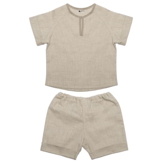 Przewiewny komplet w stylu BOHO składający się z koszulki i spodenek szortów, wykonany ze 1OO % organicznego BIO lnu najwyższej jakości.