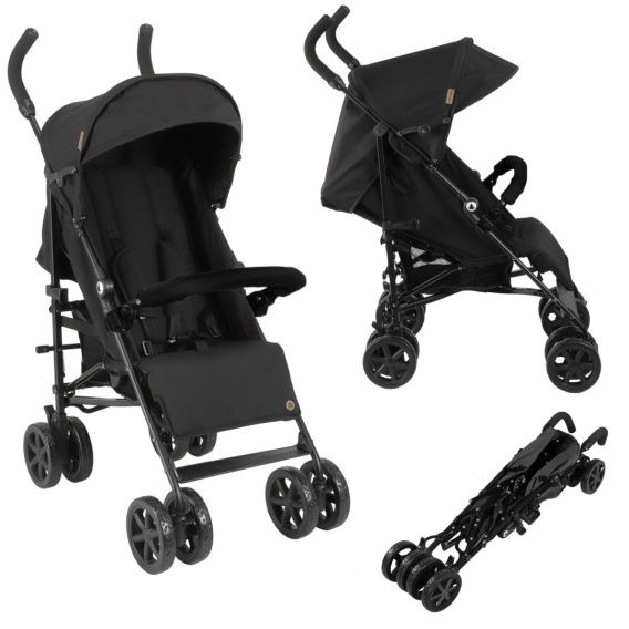 Posiada regulowane oparcie i osłonę przeciwsłoneczną.